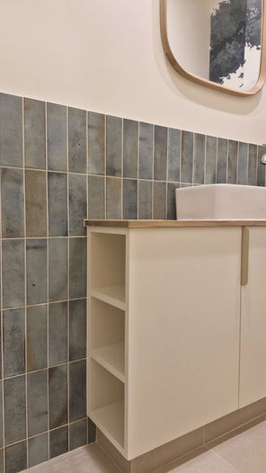 * Rendre joli et confortable cet endroit car directement visible depuis l’entrée ! D'où ce papier peint dépaysant, en trompe l'œil, pour donner de la perspective, de la profondeur, voire même, de l'espace, à ce petit coin !